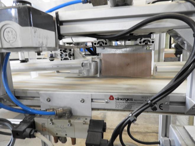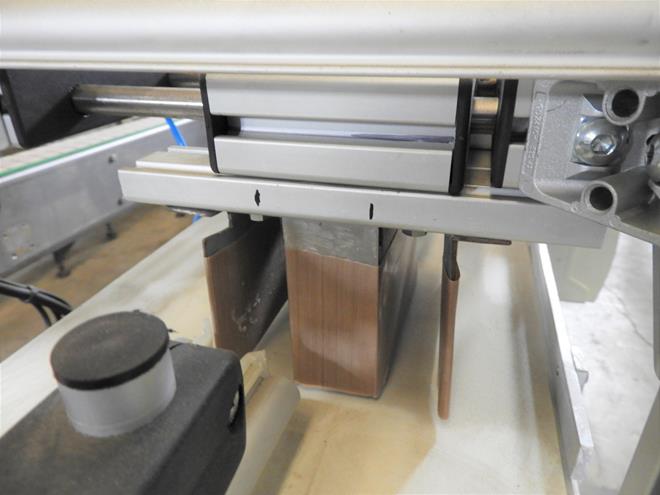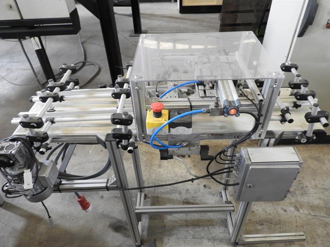 Description: Plastic belt conveyor, with guides and pneumatic piston to guide product through different lanes.