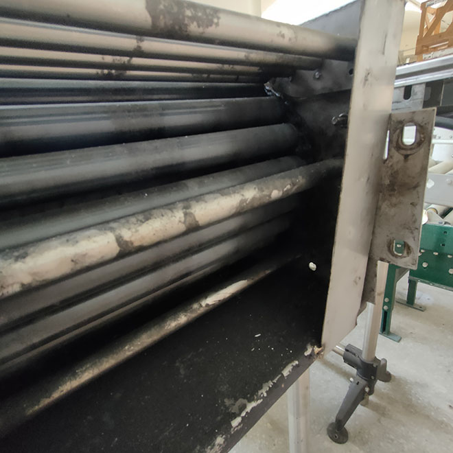 Description: Rollers conveyor belt on motorized chain cradle. INOX chassis