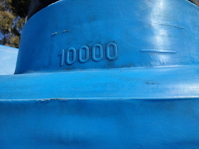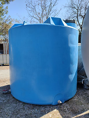 Description: Vertical tank, with flat bottom of 10m³ capacity, made of PE (polyethylene), with upper lid and lower outlet