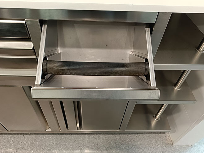Drawers, doors and hopper with integrated handle.