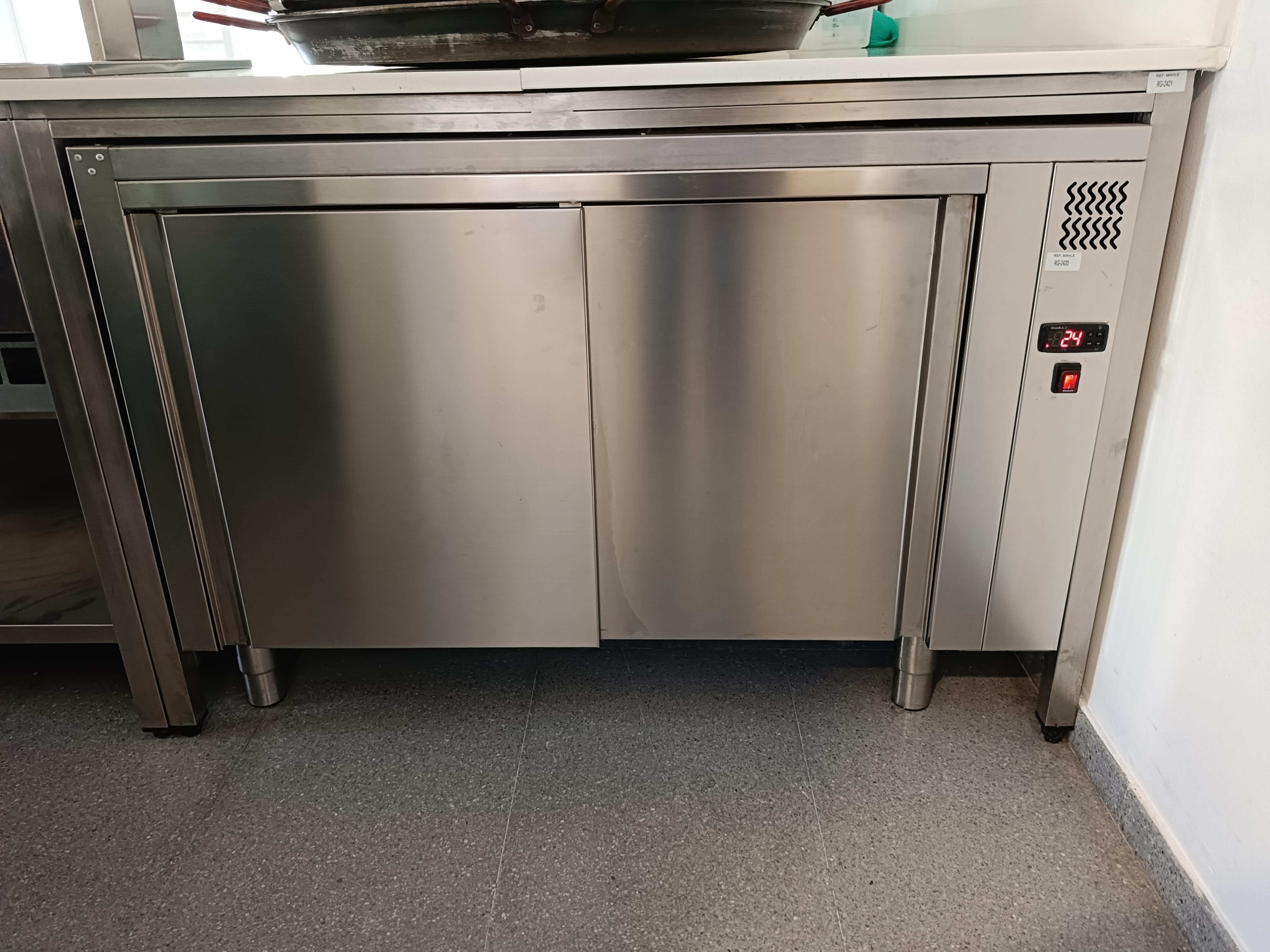 Description: Hot cupboard with two sliding doors for heating dishes before serving.