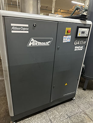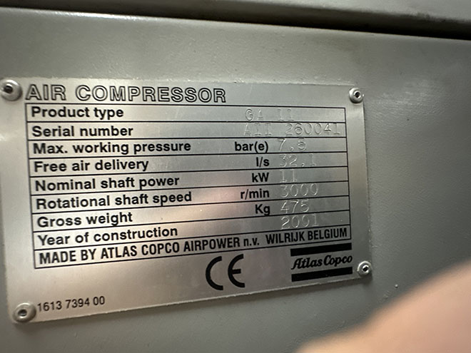 11 kW. 7.5 bar. 32.1 liters/sec. 3000 rpm. Serial No. AII 260041. Approximate weight 475 kg. Equipped with a 500-liter FICAL FIC-500/8-M tank.