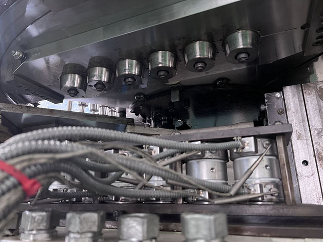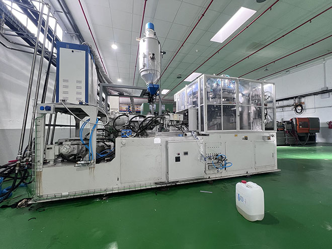 Four-station rotary machine (injection, stretching, blowing, ejection) designed for producing PET, PP, PS, etc. containers (One-step ISBM). PET bottles 200–500 ml: 2,000–4,000 units/hour depending on cavity configuration and design. Compatible materials: PET, PP, PC, PS, PEN. Standard configuration: 4 stations, 1–2 injection cavities, 2–4 blow cavities. Injection clamping force: 80–100 t. Blow clamping force: 20–30 t. Total heating power: 28 kW. Main motor: 45 kW.