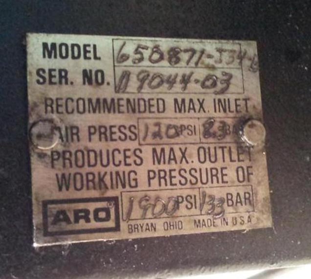 Description: Pump for ink; input pressure 120Psi/8,3bar; output pressure 1900Psi/133bar.