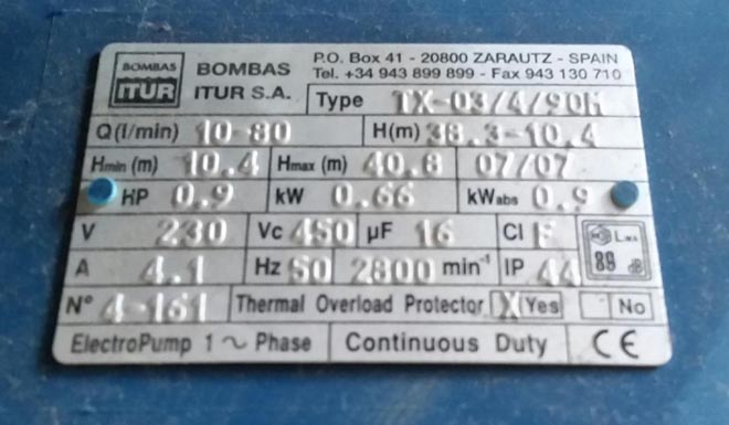 Description: Pressure group with pump ITUR type Tx-03/4/90N 10-80 l/min. 0,66 kW. With pressure switch and expansion vessel.