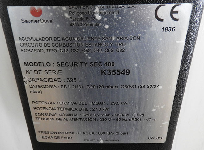 Description: Hot water boiler / storage tank of natural gas, with a sealed combustion circuit and forced draft.