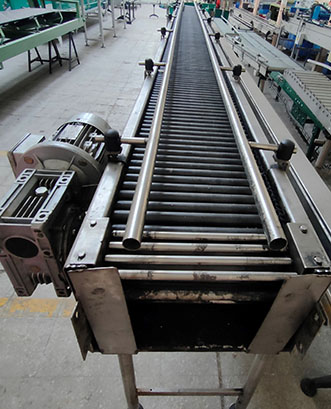 Description: Rollers conveyor belt on motorized chain cradle. INOX chassis
