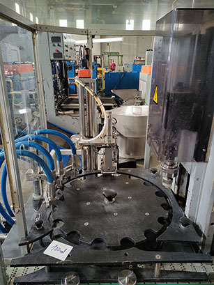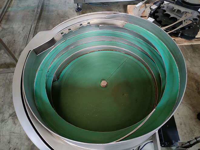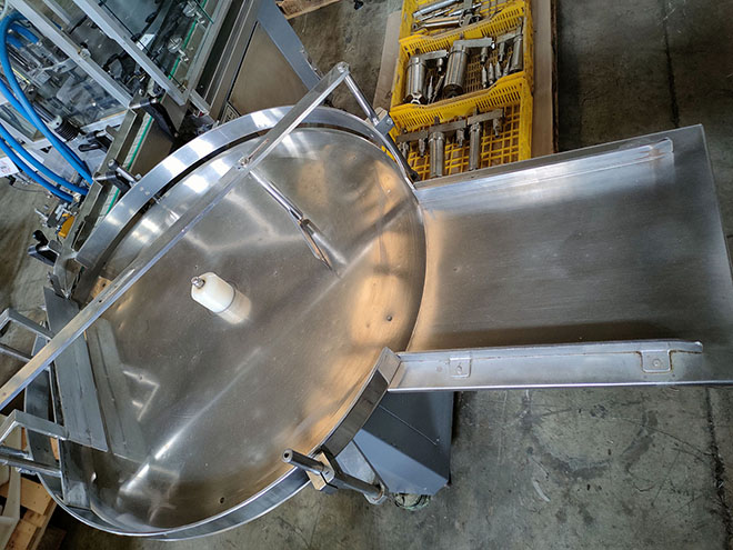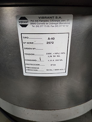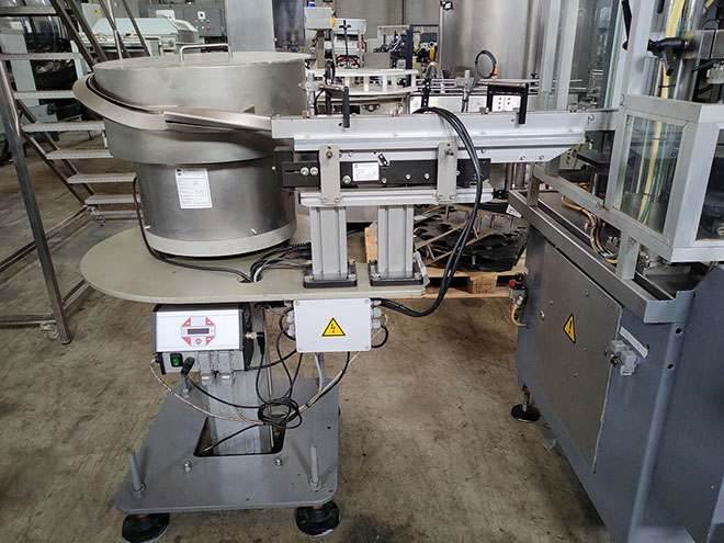 Intermediate station for the placement of plugs and stoppers by means of vibratory feeder VIBRANT model A-40 and vibratory path RHEIN-NADEL type ESK 2001