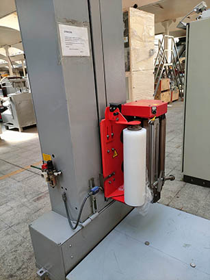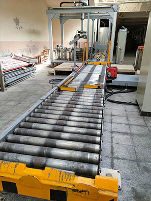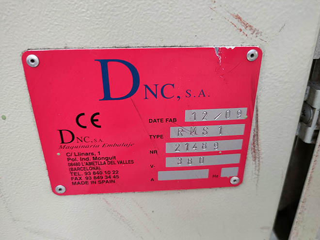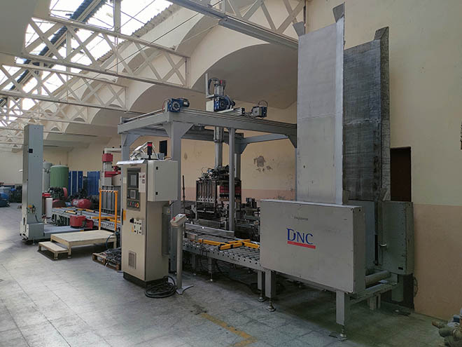 DNC LINE model pallet wrapping machine with motorized rollers, with a production capacity of up to 60 pallets/h.