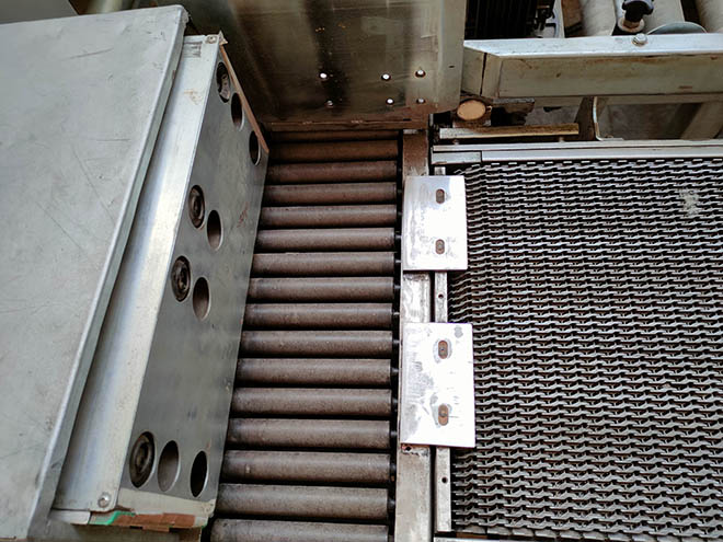 Input conveyor belts, output rollers and protections are included.