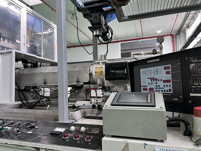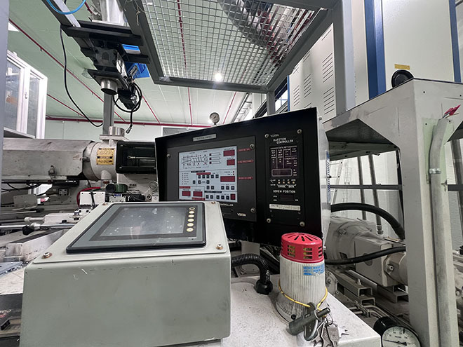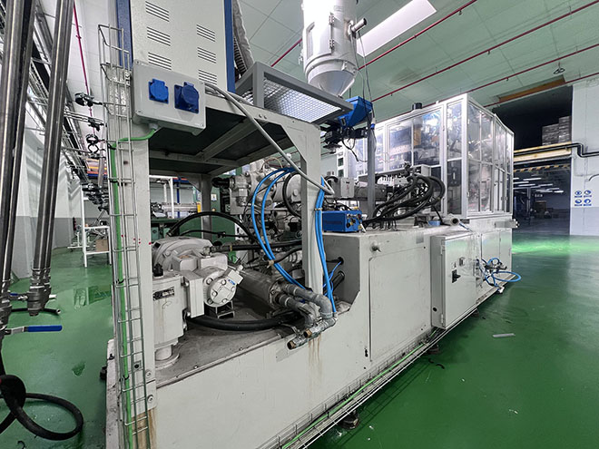 Four-station rotary machine (injection, stretching, blowing, ejection) designed for producing PET, PP, PS, etc. containers (One-step ISBM). PET bottles 200–500 ml: 2,000–4,000 units/hour depending on cavity configuration and design. Compatible materials: PET, PP, PC, PS, PEN. Standard configuration: 4 stations, 1–2 injection cavities, 2–4 blow cavities. Injection clamping force: 80–100 t. Blow clamping force: 20–30 t. Total heating power: 28 kW. Main motor: 45 kW.